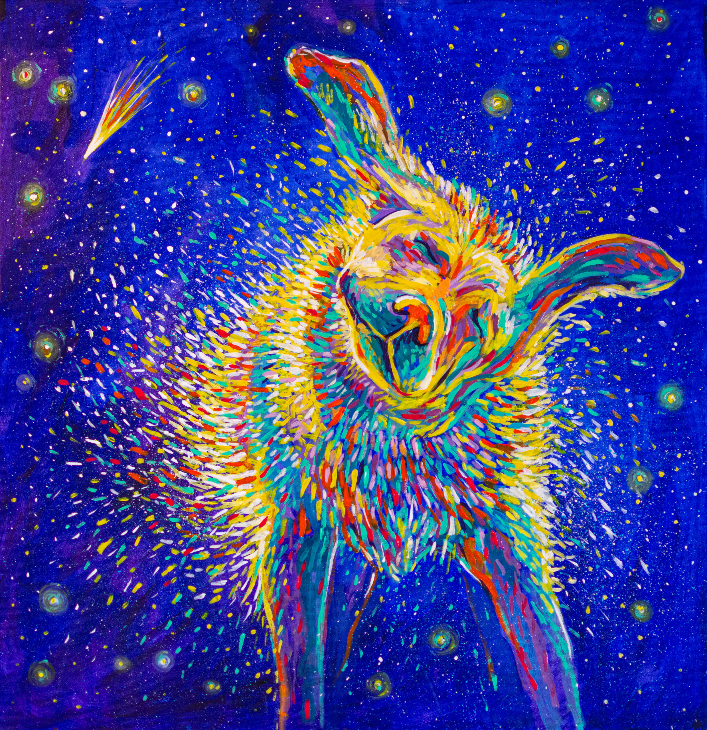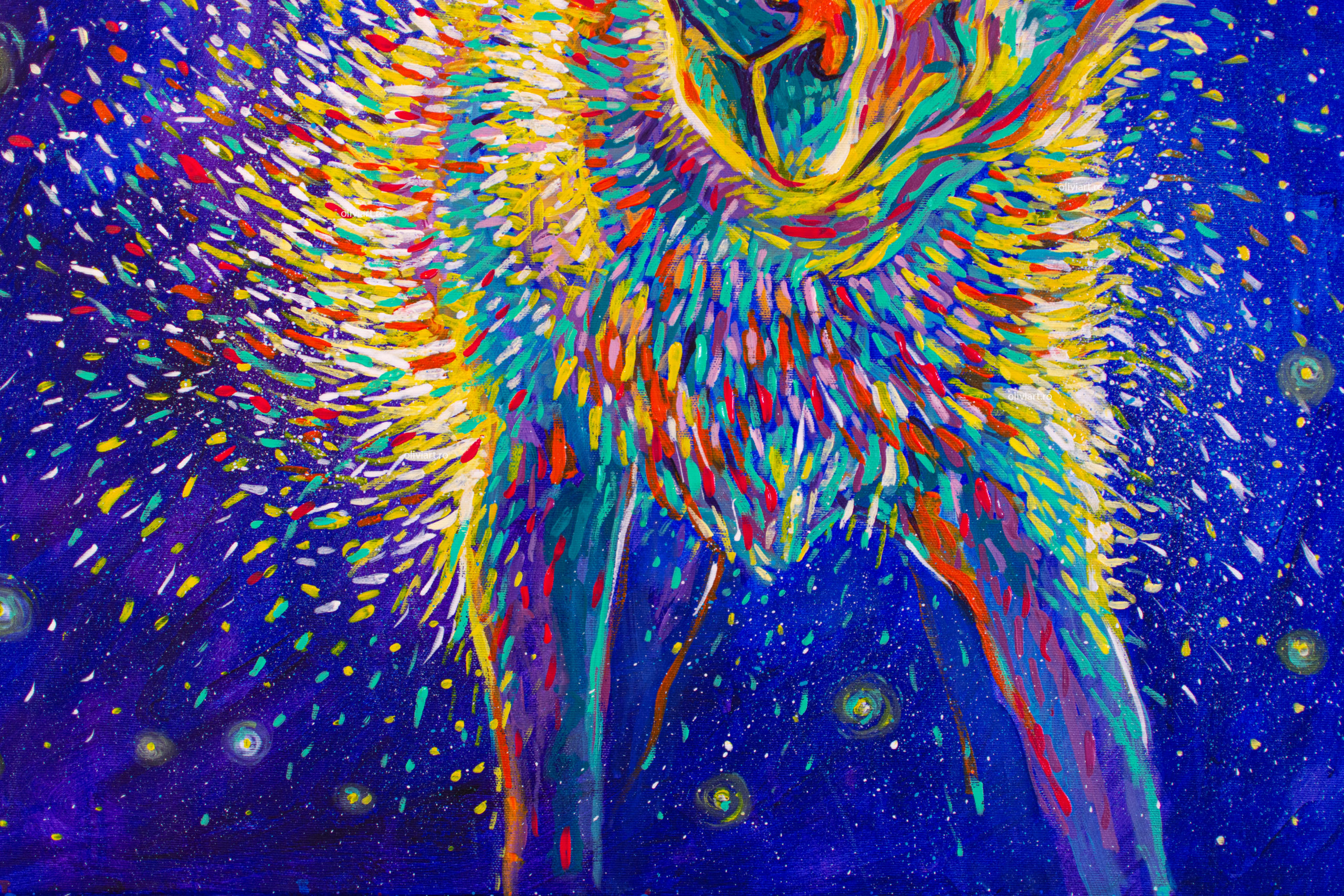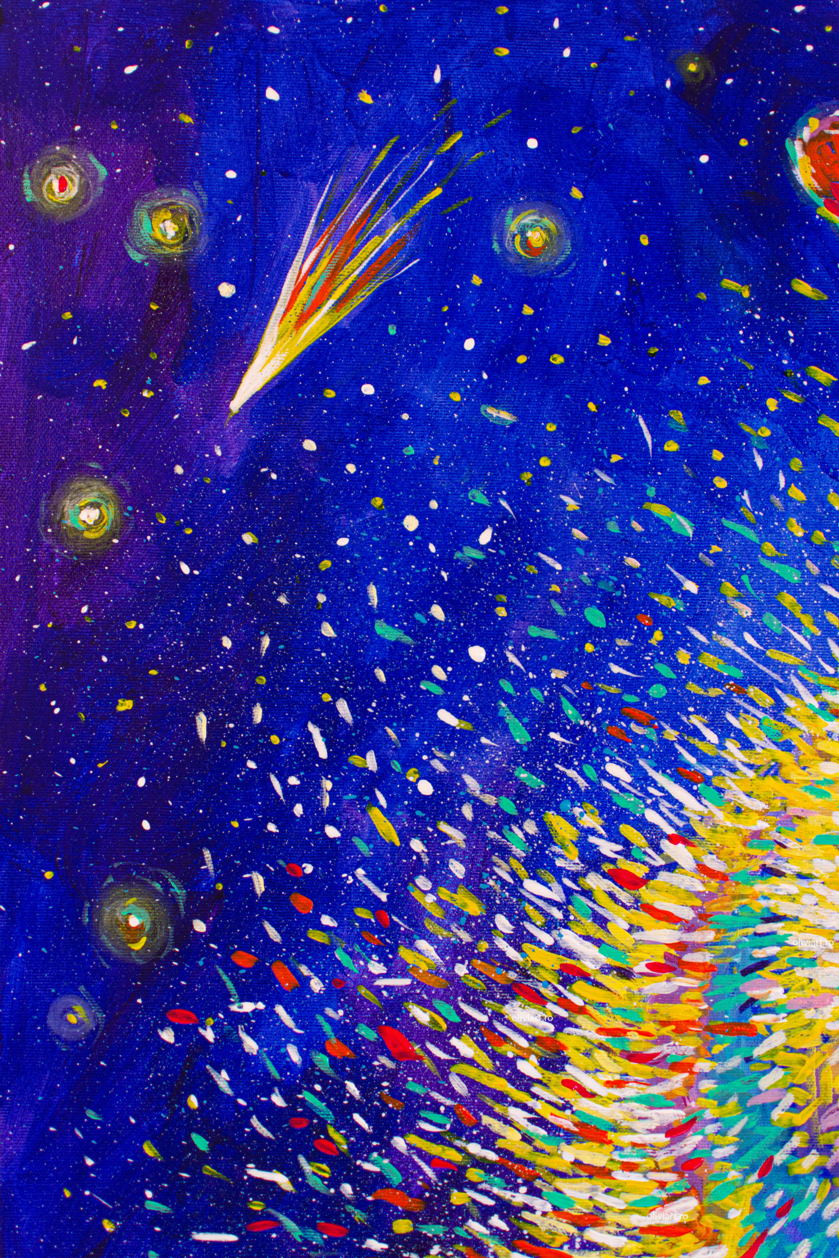 The entire “Celestial” series tackles subjects such as what our place in the universe, life, death and transcendence. “Shaking Stars into the Sky” is a joyful metaphor of cosmogony. The artist proposes an imaginary creation of the universe. The colorful droplets are flung into the universe and become stars. The ever-present falling star has many meanings, it can be a good omen, a bad one or just a reminder of the fact that time is fleeting.