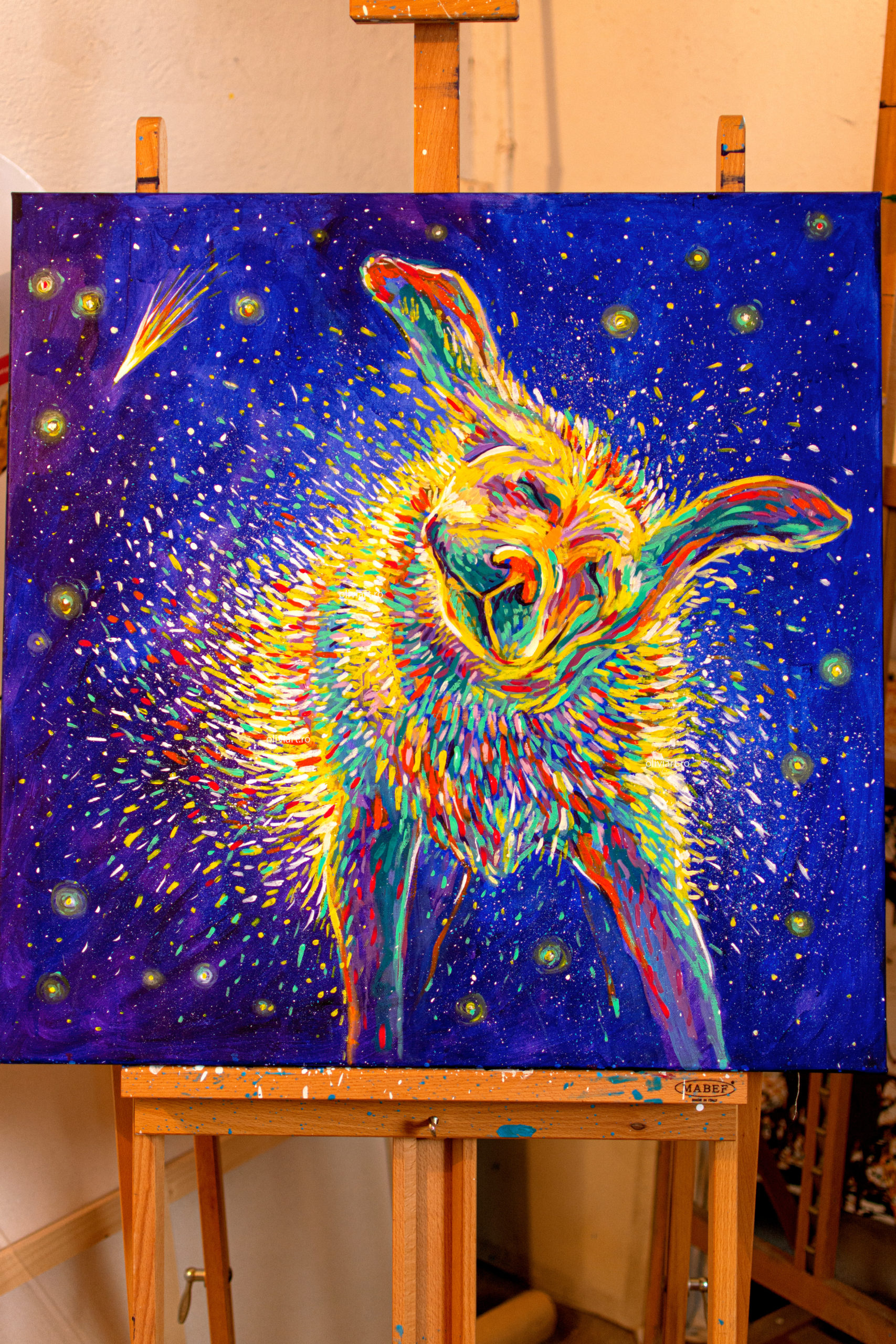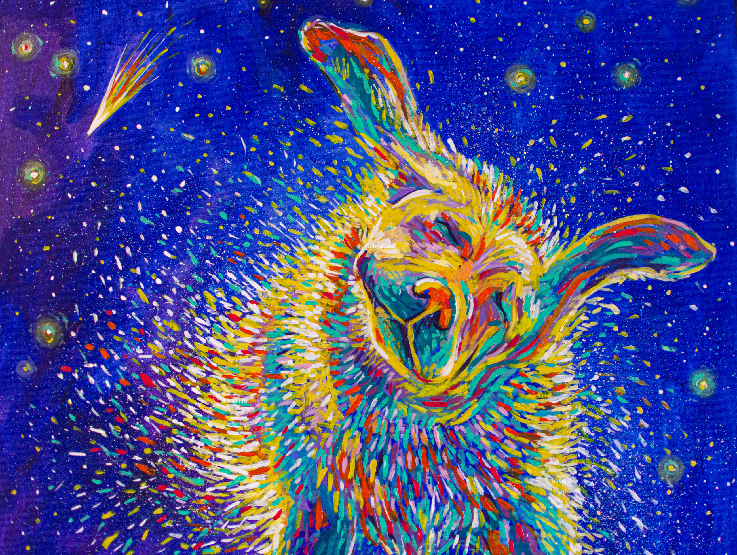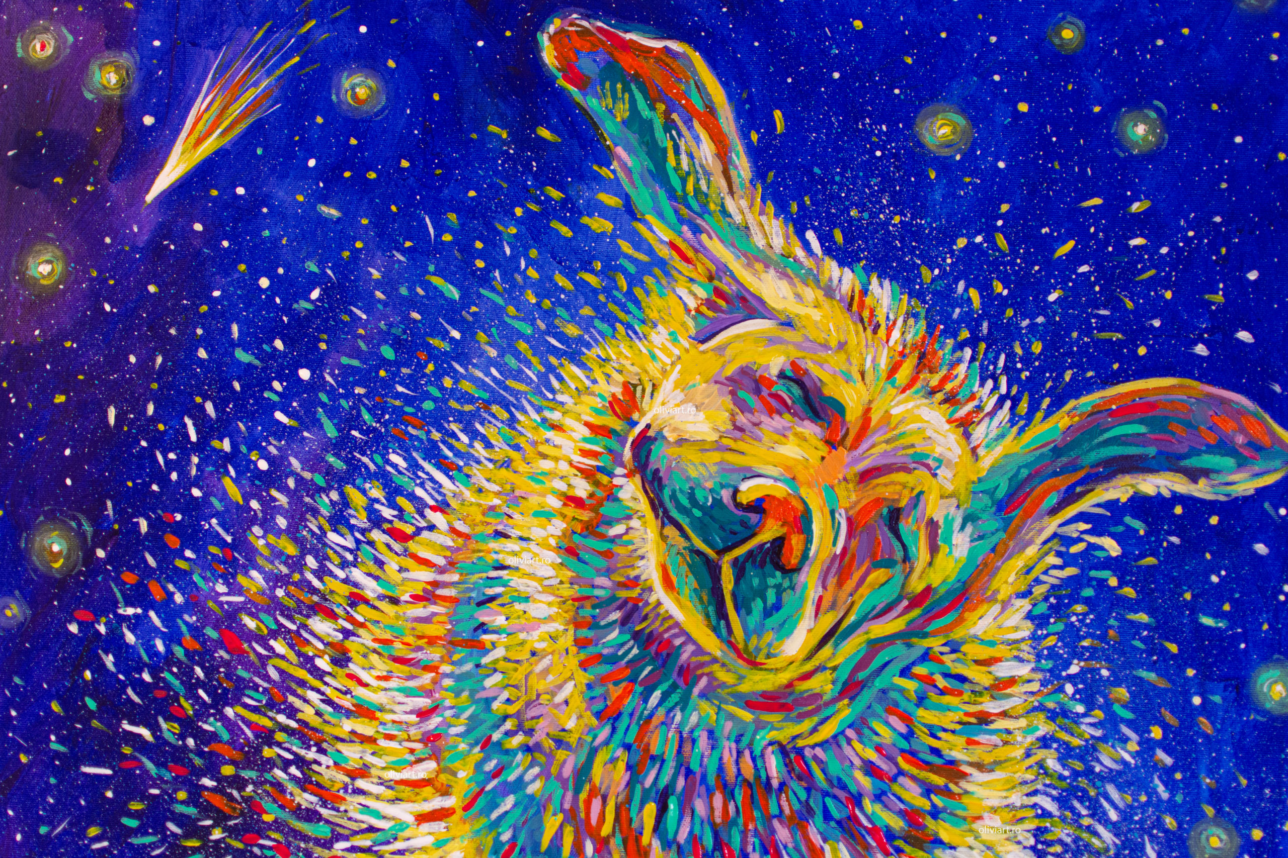 The entire “Celestial” series tackles subjects such as what our place in the universe, life, death and transcendence. “Shaking Stars into the Sky” is a joyful metaphor of cosmogony. The artist proposes an imaginary creation of the universe. The colorful droplets are flung into the universe and become stars. The ever-present falling star has many meanings, it can be a good omen, a bad one or just a reminder of the fact that time is fleeting.